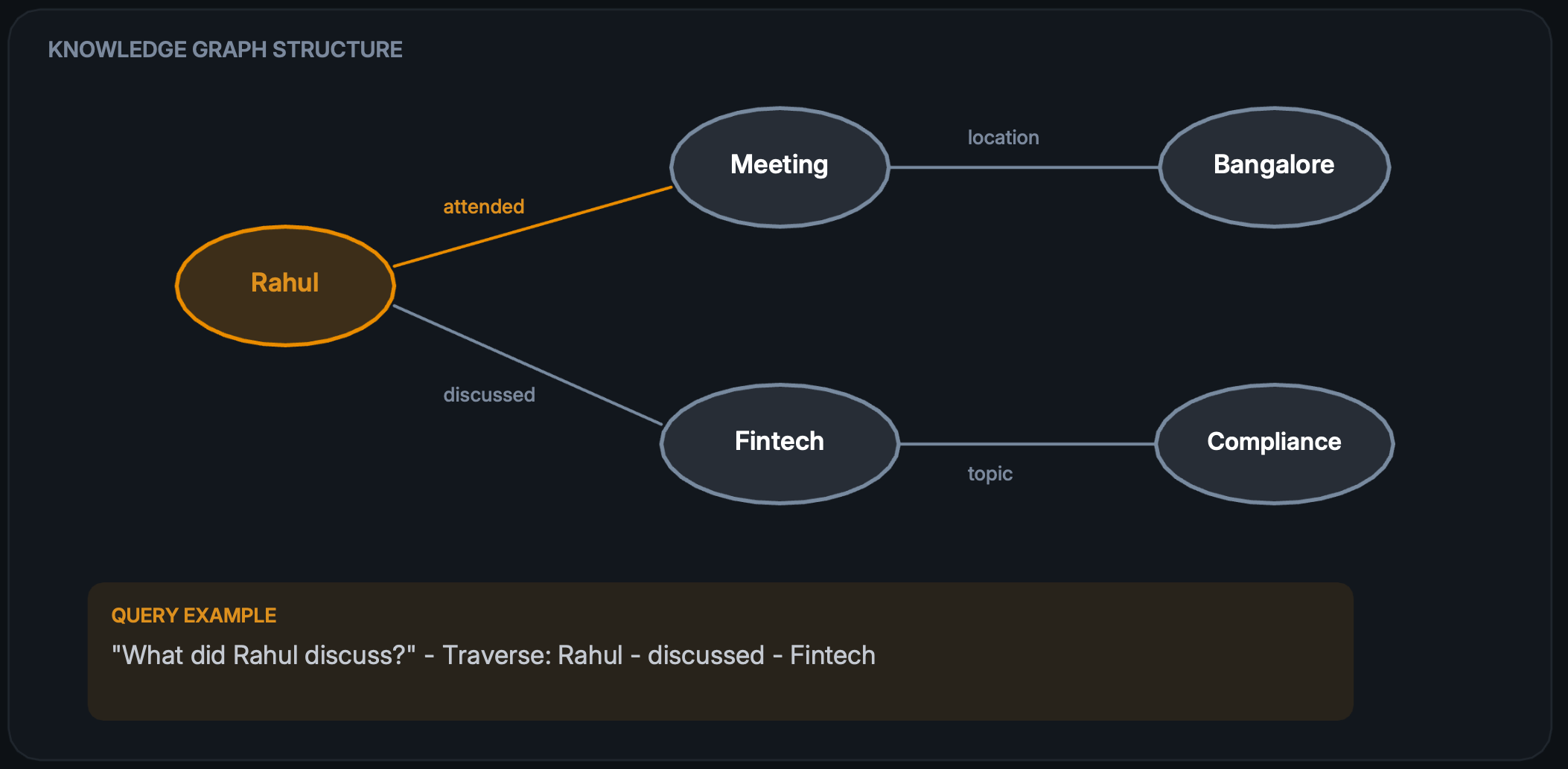 This structure enables traversal-based reasoning. The system can follow relationship chains, answer questions about connections, and infer implicit relationships through graph algorithms.
