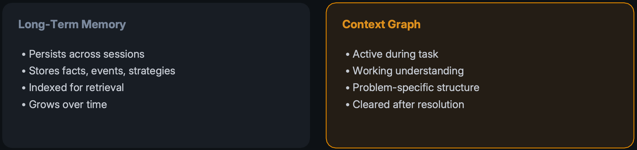 While long-term memory stores accumulated knowledge, context graphs represent the agent's current understanding of a problem. Think of it as the difference between a library and the notes spread across your desk while working.