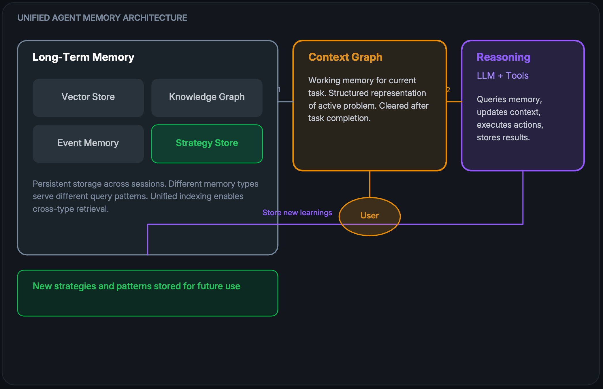 This architecture enables sophisticated behavior. The reasoning engine can query long-term memory for relevant context, build a problem-specific context graph, execute solutions, and store successful patterns back into long-term memory.