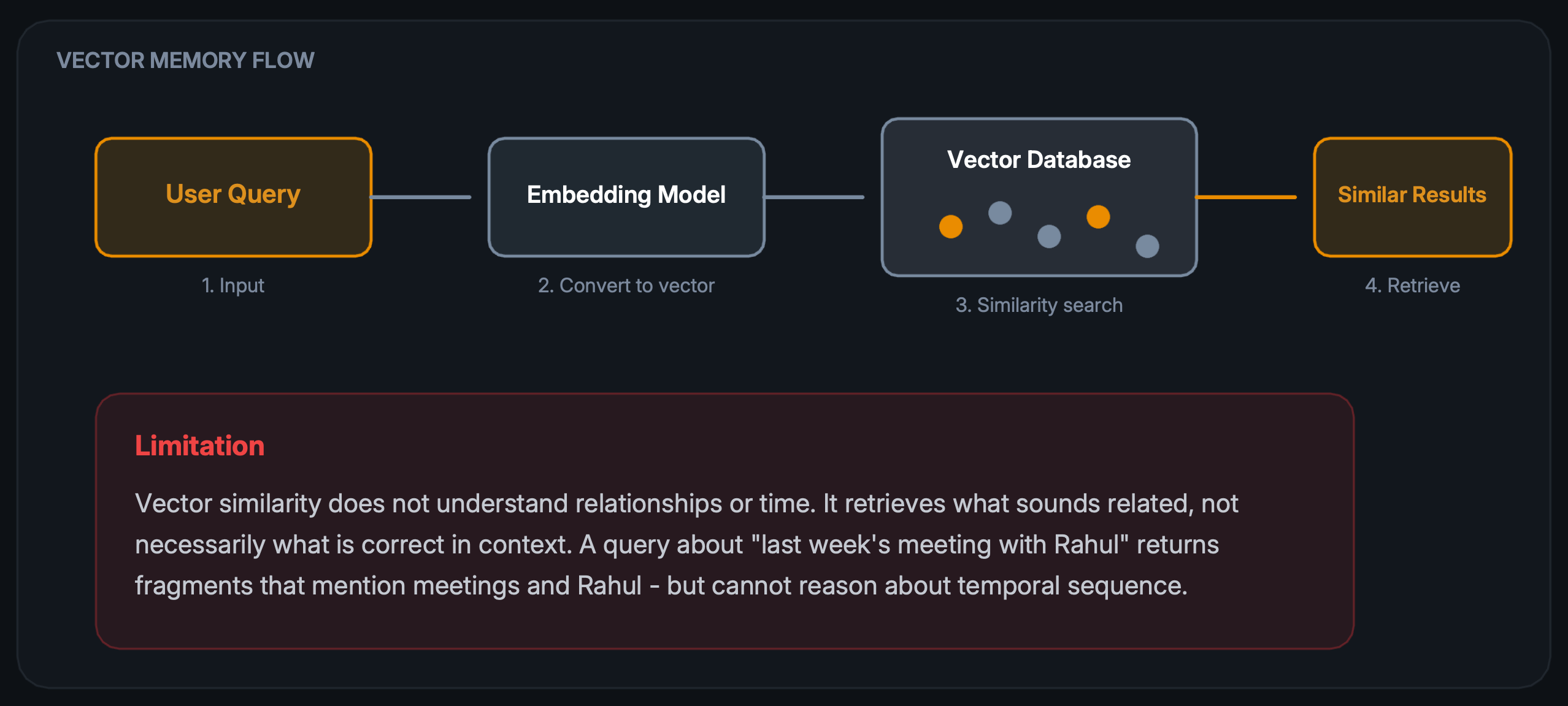 The first generation of agent memory relies on vector embeddings. Conversations are broken into chunks, converted to high-dimensional vectors, and stored in specialized databases. When context is needed, the system performs similarity search to retrieve relevant fragments.