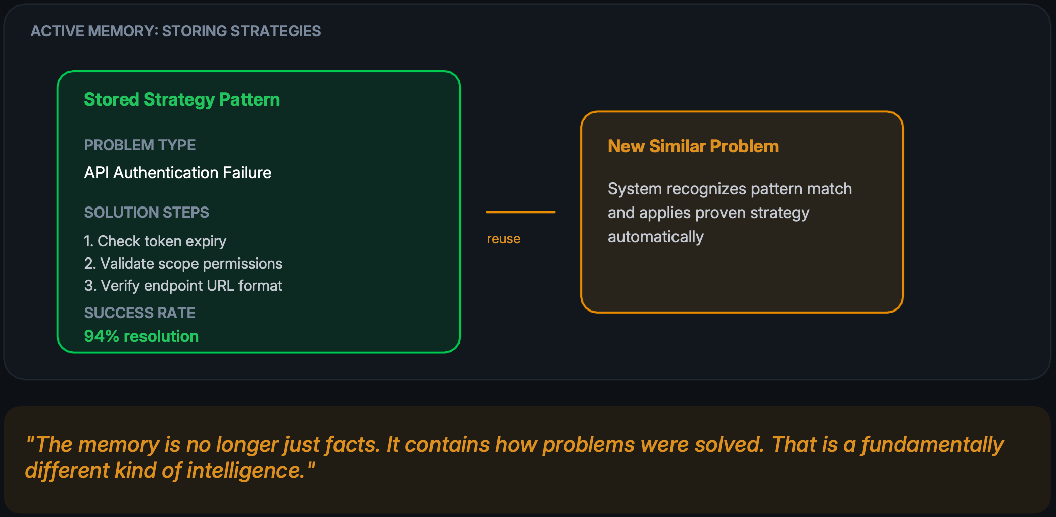 Active memory represents a paradigm shift. Instead of storing data about what happened, the system stores how problems were solved—the strategies, steps, and patterns that led to successful outcomes.