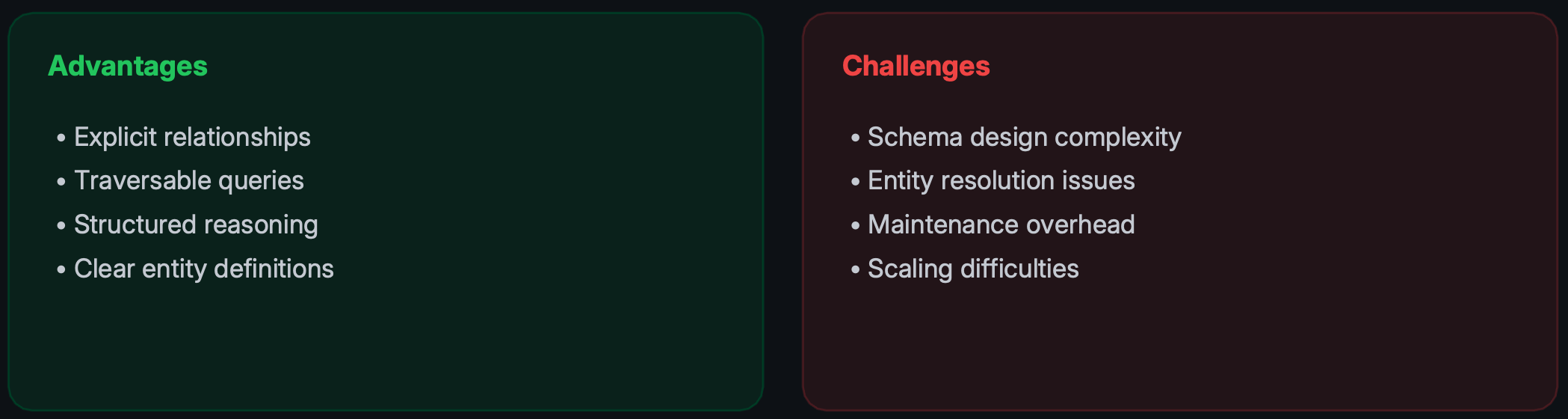 Knowledge graphs work well for domains with clear entity types and predictable relationships. They struggle when information is ambiguous, relationships are implicit, or the schema needs to evolve rapidly.