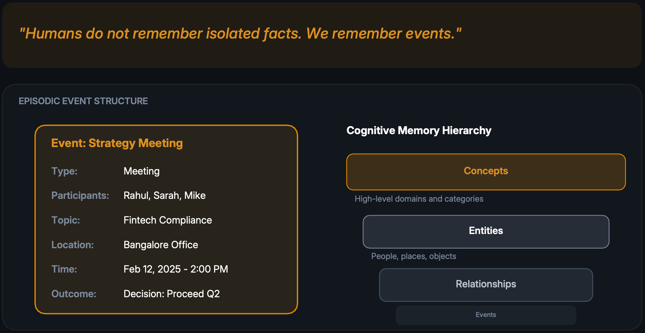 Episodic memory borrows from cognitive science. Rather than storing isolated facts or relationships, the system records complete events with full context—participants, topics, locations, timestamps, and outcomes.