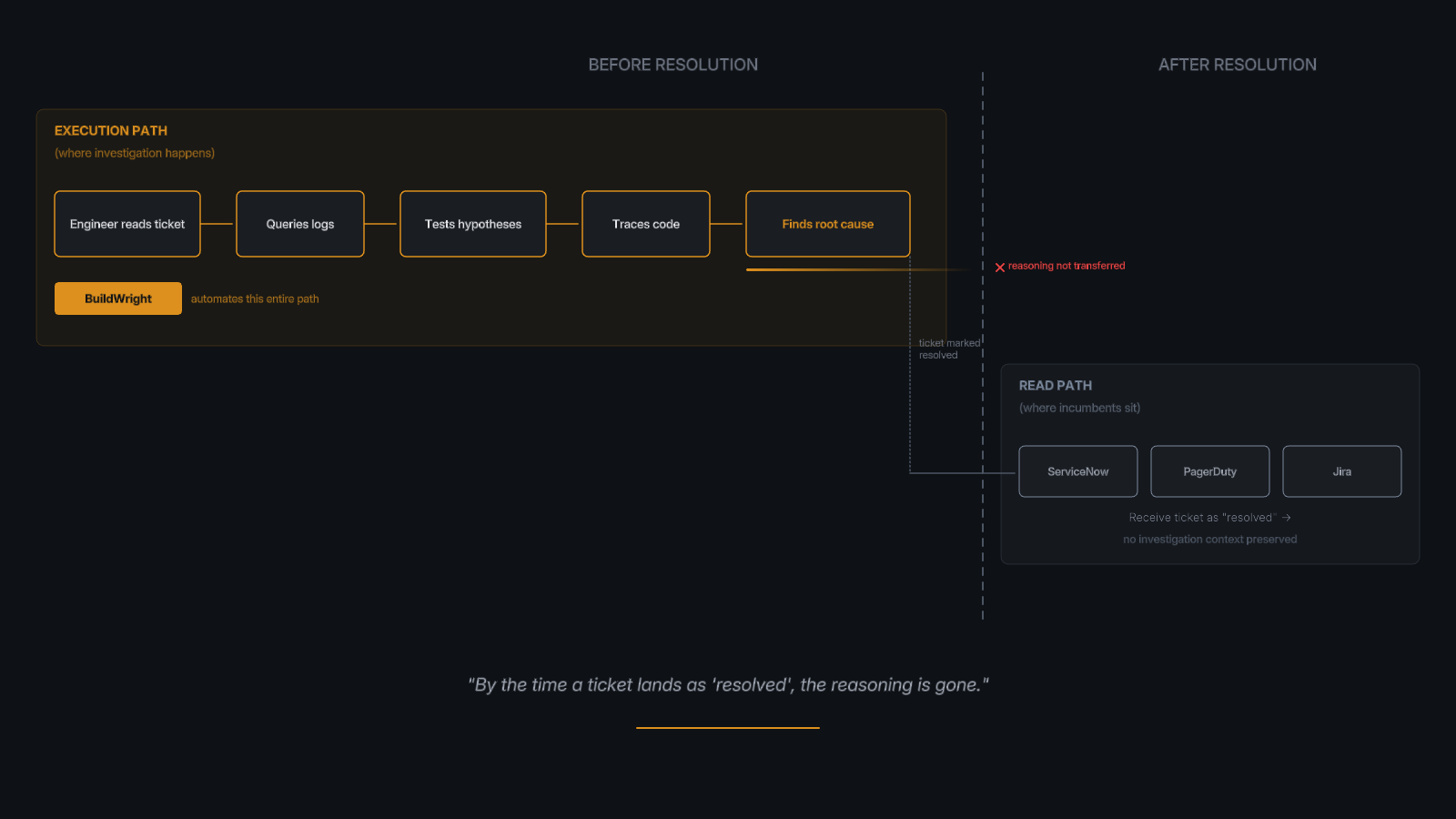 ServiceNow knows what the ticket looks like now. It doesn't know what the investigation looked like when the engineer was deciding where to look. PagerDuty knows which alert fired. It doesn't know which logs the engineer checked, which hypotheses were eliminated, or which prior tickets informed the diagnosis. By the time a ticket lands as "resolved" in any system of record, the investigation reasoning is gone.
