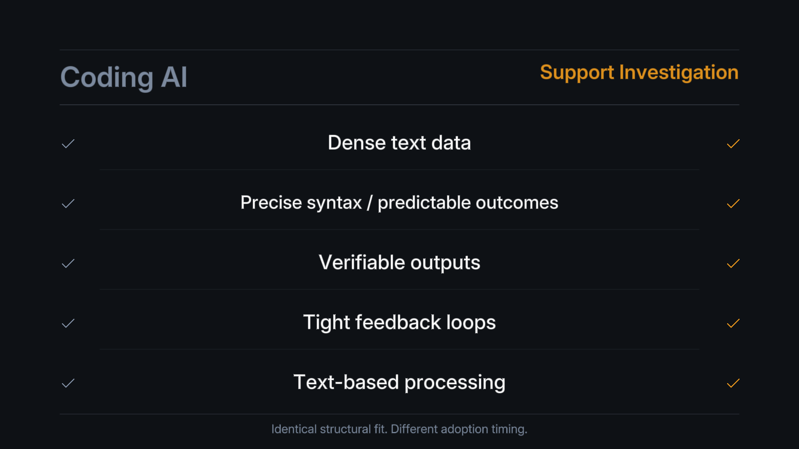 Coding AI had a head start because engineers are early adopters who choose their own tools. Support investigation requires a platform that integrates with the enterprise's ticketing system, codebase, observability stack, and databases. The integration surface is larger. The buyer is a VP Engineering with a procurement process, not an individual developer with a credit card.